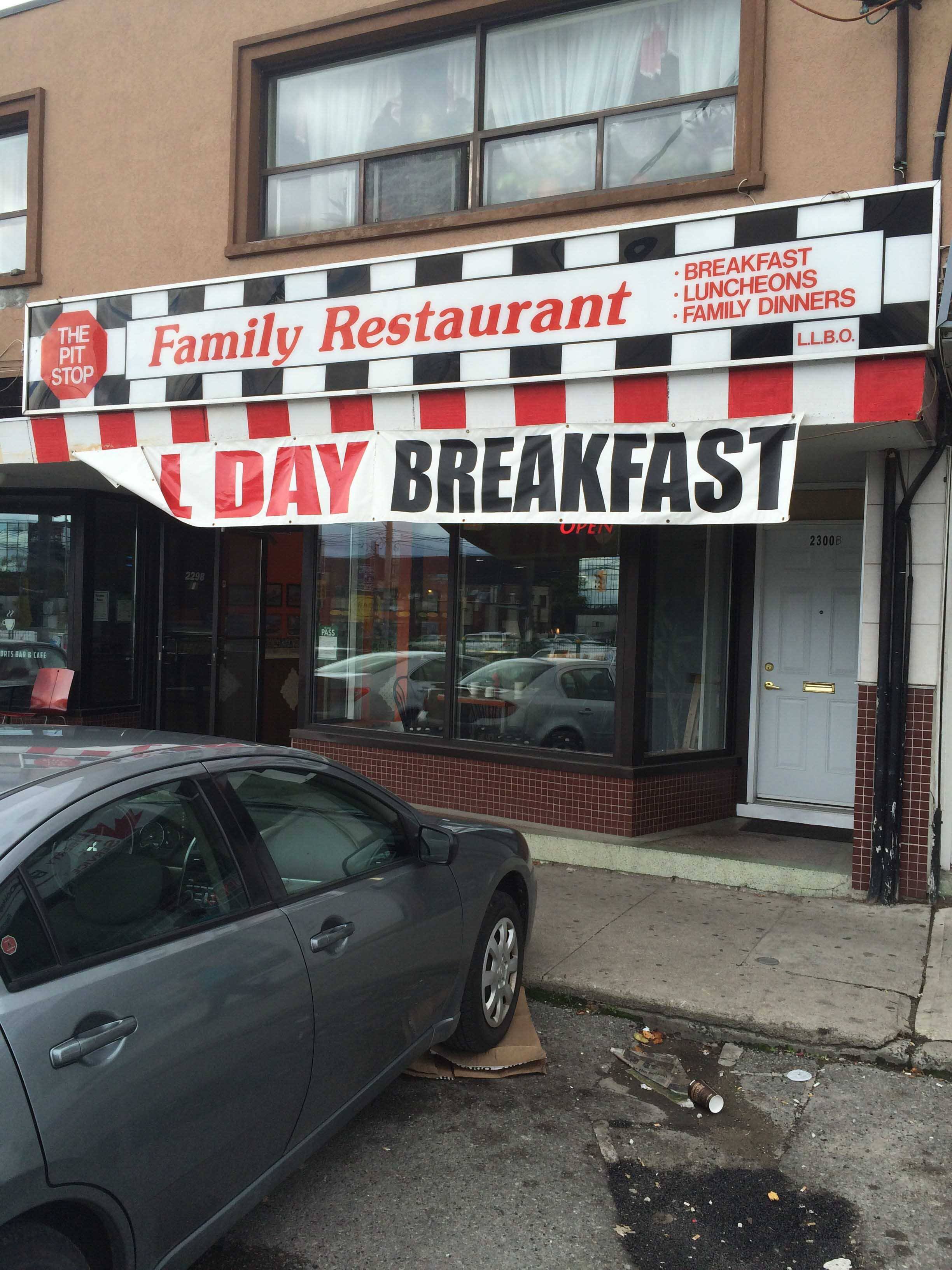 The place is decorated in a mish mash of eccentric tile work, and a chair rail height border of 8 1/2" x 11" framed pictures of classic cars.